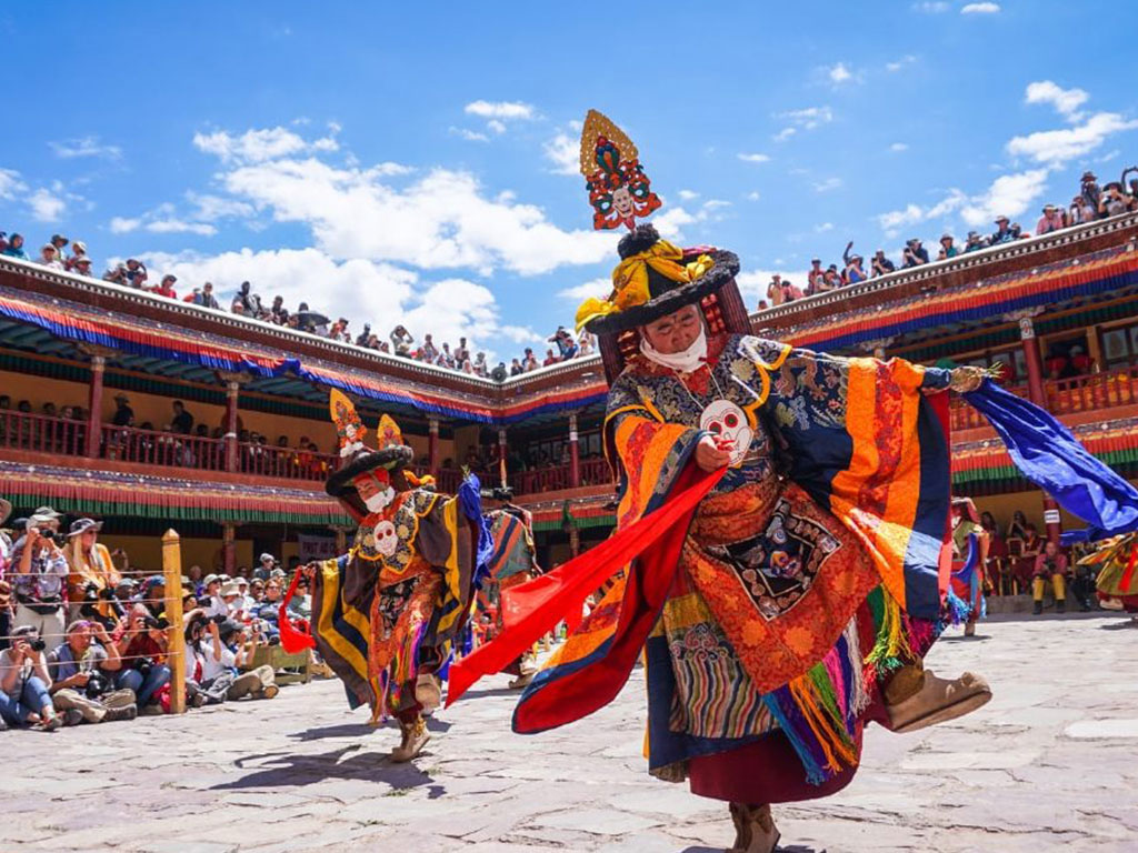 The Chaam is the highlight of the festival where the monks perform their dances wearing fierce masks. As a part of the dance, a sculpture made out of dough is destroyed with a sword, representing the vanquishing of the demons by the wisdom and compassion of Padmasambhava. The sculpture is then broken and burnt, and the ashes are thrown in different directions for the purification of the soul after death.
