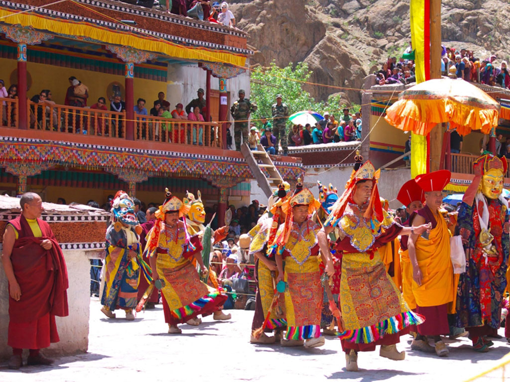 Das Hemis Festival ist eine lebhafte zweitägige Feier in Ladakh, Indien, zu Ehren von Guru Padmasambhava, der den tantrischen Buddhismus im Himalaya-Königreich einführte. Der Innenhof des Hemis-Klosters, des größten buddhistischen Klosters in Ladakh, ist die Bühne für dieses berühmte Fest. Der farbenfrohe Festumzug findet am 10. Tag des tibetischen Mondmonats statt. Die Einheimischen sind zu diesem Anlass in ihre schönsten traditionellen Gewänder gekleidet. Mönche führen prächtige Maskentänze und sakrale Spiele auf, die von Zimbeln, Trommeln und langen Hörnern begleitet werden. Der Obermönch leitet die Veranstaltung. Ein farbenfroher Jahrmarkt, auf dem einige schöne Kunsthandwerke ausgestellt werden, ist der besondere Höhepunkt des Festivals.