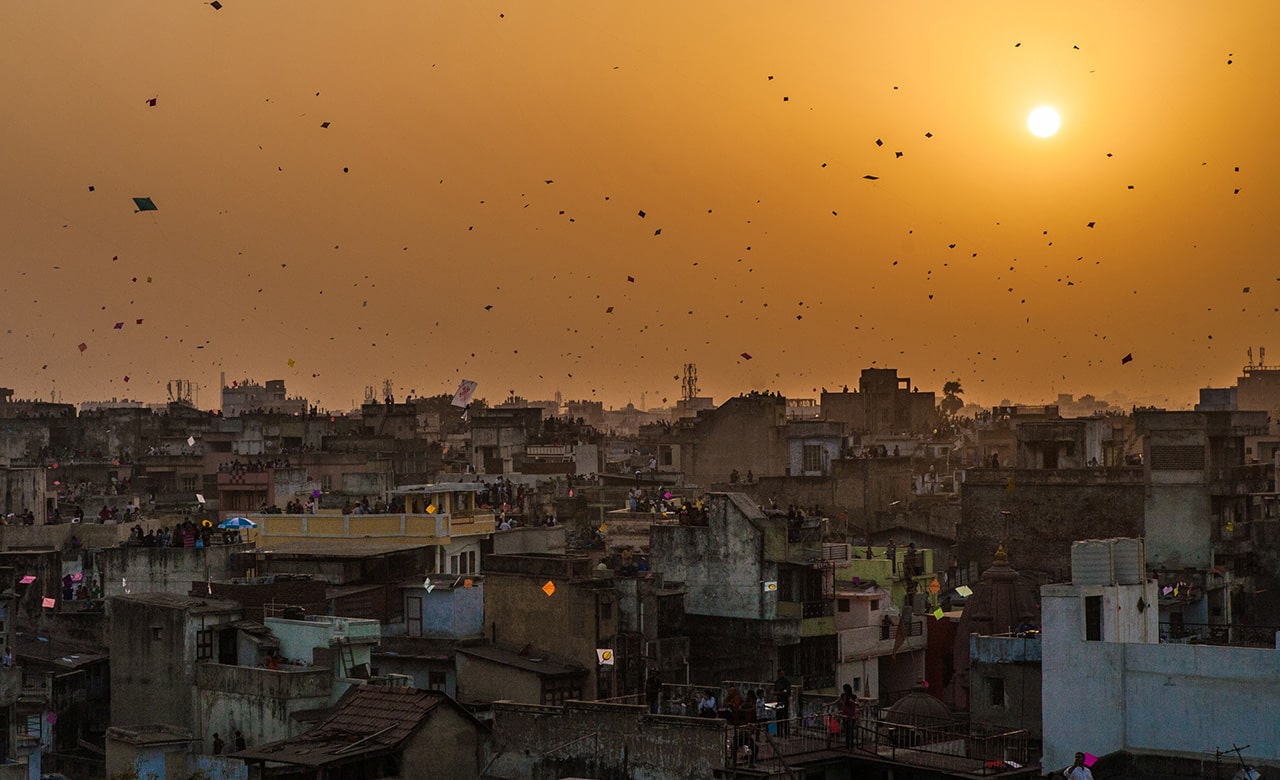Das Drachensteigenlassen ist zwar in ganz Indien ein fester Bestandteil des Uttarayan, doch in Gujarat ist es etwas ganz Besonderes: Die historische Stadt Ahmedabad aus dem 15. Jahrhundert, die von der UNESCO zum Weltkulturerbe erklärt wurde, liegt am Ostufer des Flusses Sabarmati. Sie ist mehr als 200 Jahre älter als Shahjahanabad oder Alt-Delhi und soll die Inspiration für die vom Mogulkaiser Shahjahan erbaute Kaiserstadt sein. Genau wie Alt-Delhi ist die historische, von Mauern umgebene Stadt Ahmedabad eine verblüffende Mischung aus traditionellen Siedlungsmustern, einer multikulturellen Bevölkerung, die sich hauptsächlich aus muslimischen, hinduistischen und Jain-Gemeinschaften zusammensetzt, und zahlreichen voneinander abhängigen Berufspraktiken. Das Drachensteigenlassen während des Uttarayan ist ein kollektiver, inklusiver Brauch, an dem sich verschiedene kulturelle Gruppen beteiligen – Bewohner der alten Stadt, Bewohner des neuen Teils von Ahmedabad, die Großfamilienmitglieder oder Freunde sind, sowie Touristen aus ganz Indien und der Welt.
