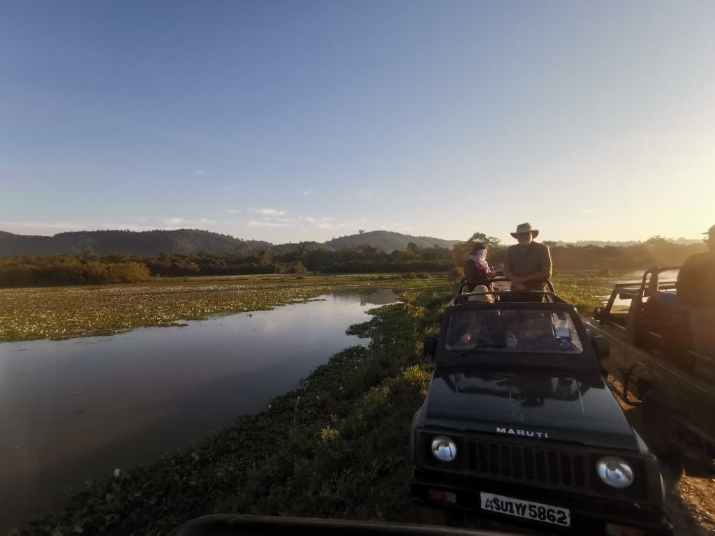 El Parque Nacional de Kaziranga es increíblemente bello, sobre todo cuando lo baña la luz dorada de la mañana y el atardecer. Ver tantos rinocerontes de un solo cuerno nos dejó sin aliento. Para quienes hayan estado en África, sin duda fue un espectáculo sorprendente ver grandes grupos de la especie india pastando, durmiendo, revolcándose y vadeando. Puede que no viéramos ningún tigre, pero fuimos recompensados con numerosos avistamientos de otros animales salvajes.