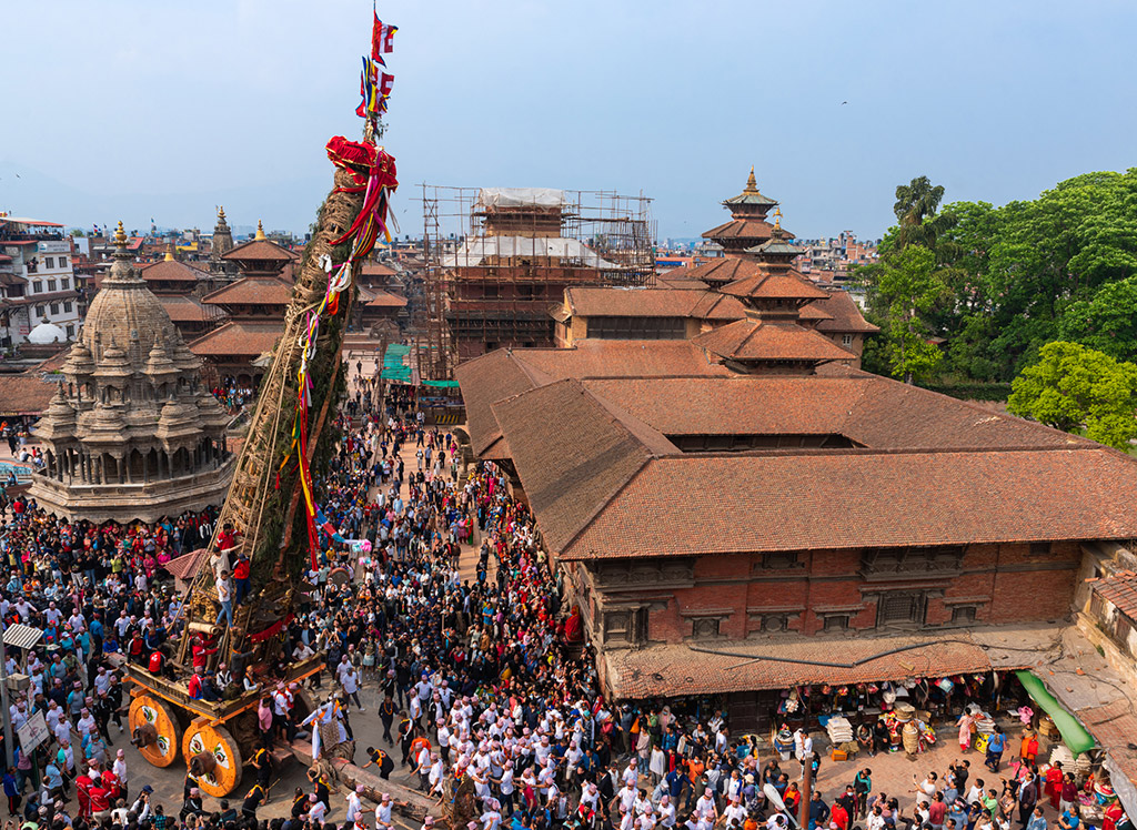 El Rato Machhindranath Jatra es uno de los festivales de carros más antiguos y prolongados de Nepal, que se remonta al siglo VII d.C. En la antigua ciudad de Patan, cientos de personas se reúnen para participar en el ritual sagrado de tirar de un colosal carro de 48 pies construido con bambú y madera. Este magnífico carro, con cuatro enormes ruedas, lleva el venerado ídolo de Rato Machindranath, la encarnación del Dios de la Lluvia en la mitología nepalesa. El ídolo es venerado tanto por hindúes como por budistas y lleva múltiples nombres. Durante esta rara y auspiciosa ocasión, el carro emprende un viaje extraordinario, tirado durante un mes por devotos desde Bungamati hasta Pulchowk, atravesando rutas pintorescas por Bhaisepati, Nakhu, Bhanimandal y Jhamsikhel. Existe una tradición única en la que las mujeres tiran exclusivamente del carro durante una parte específica de la procesión. La leyenda sostiene que el rey Narendra Dev invitó a la deidad desde Assam para aliviar una sequía devastadora. El festival concluye con el Bhoto Jatra, en el que se exhibe al público un chaleco enjoyado perteneciente al dios.