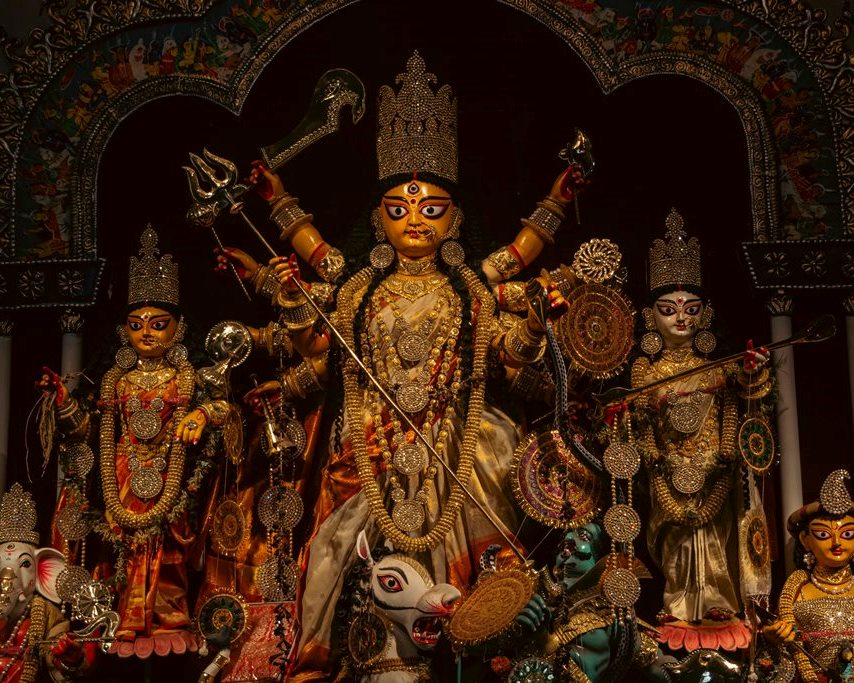 Para los bengalíes, el otoño equivale a felicidad, ya que su “Ma” (madre) vuelve a casa con sus hijos en esta época. Así de hogareñas son las festividades del Durga Puja en Bengala y para los bengalíes. Es esa época del año en la que planifican meticulosamente cada día: qué vestir, dónde ir, con quién quedar, qué comer, qué cocinar, etc. Nada más importa. Las mujeres sacan a relucir toda la joyería tradicional y los mejores saris tradicionales, que en otras épocas del año quedan desperdiciados en algún rincón del armario. Aquí Durga, la gran asesina de demonios, se convierte en tía, madre, hija e incluso amiga del pueblo. Hay jolgorio junto con rituales para la vuelta anual a casa como los que uno esperaría que se desarrollaran cuando un pariente querido vuelve a casa.