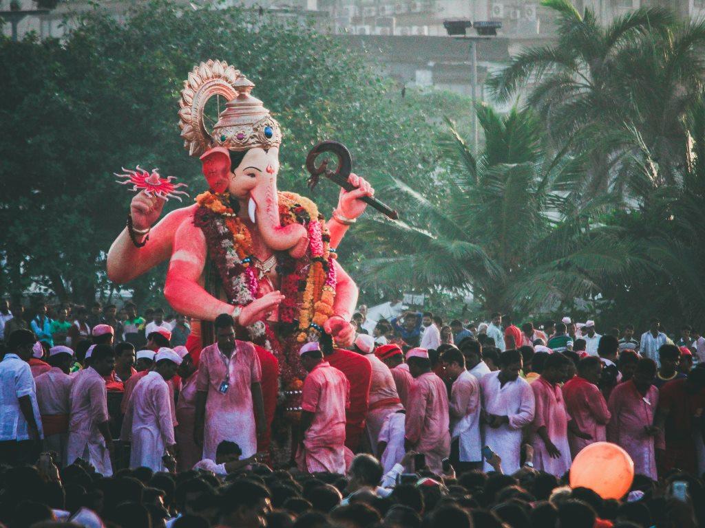 Ganesh Chaturthi est un festival de dix jours qui célèbre l’anniversaire de Ganesha, la divinité hindoue à tête d’éléphant. Le festival commence par l’installation d’idoles de Ganesha magnifiquement sculptées dans les maisons et les mandaps (grands auvents). Pendant les dix jours que dure le festival, les friandises et les plats salés préférés de Ganesha sont préparés et distribués à la population. Le 11e jour, les idoles de Ganesha sont portées en procession avec beaucoup de fanfare et immergées dans la mer, symbolisant un rituel au cours duquel Ganesha retourne à sa demeure, emportant avec lui les soucis et les difficultés de ses fidèles. La plus longue procession d’immersion est celle de Lalbaughcha Raja, à Mumbai, qui commence vers 10 heures et se termine le lendemain matin, soit une durée de près de 24 heures.