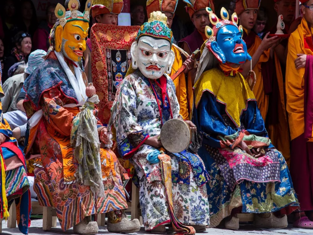 Чаам – это кульминация фестиваля, где монахи исполняют свои танцы в свирепых масках. Во время танца скульптура, сделанная из теста, разрушается мечом, что символизирует победу над демонами благодаря мудрости и состраданию Падмасамбхавы. Затем скульптуру разбивают и сжигают, а пепел разбрасывают в разные стороны для очищения души после смерти.