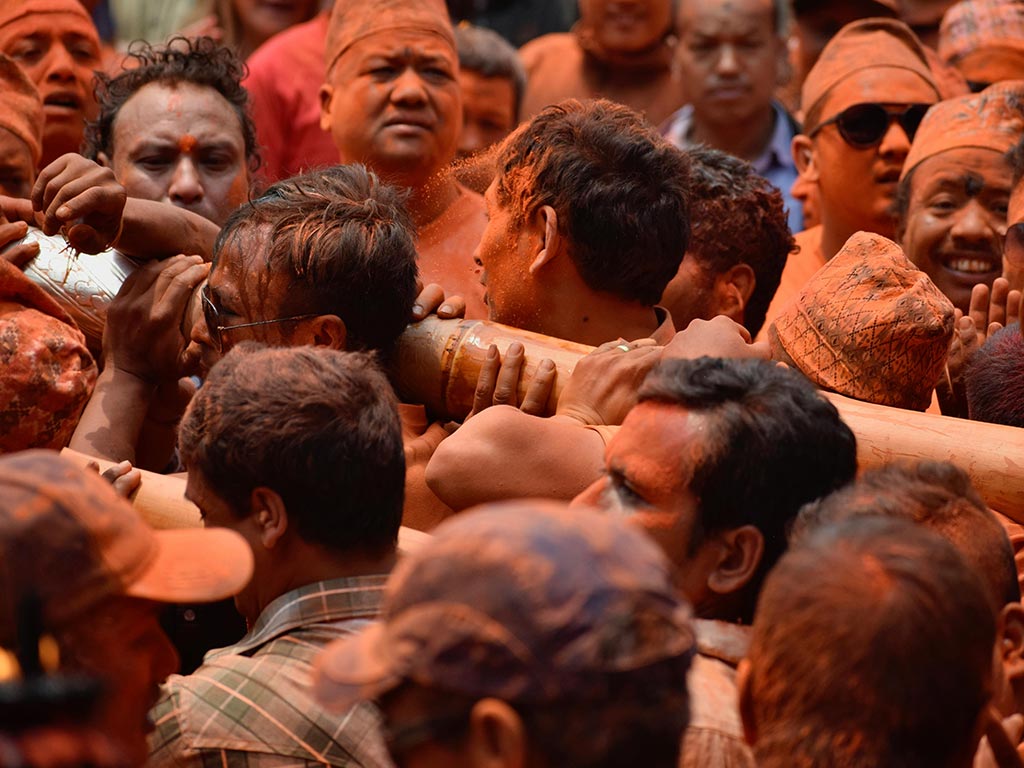 Главная достопримечательность Джатры – деревянный столб длиной 25 метров (82 фута), изображающий злобных змей. В канун Нового года столб вытягивают, символизируя победу добра над злом. Люди участвуют в перетягивании каната, чтобы затащить колесницу со статуей местного божества-покровителя, которое помогло жителям Бхактапура убить змей. Колесницу запрягают с двух сторон, и та часть города, которая побеждает в конкурсе, получает возможность прокатиться на колеснице.